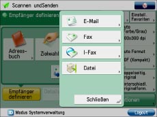 Sie können das System so einstellen, dass die Faxfunktion auf dem Hauptmenüdisplay angezeigt wird. Wenn Sie sich dafür entscheiden, können Sie wählen, ob die Faxfunktion in [Scannen und Senden] angezeigt werden soll. Wenn die Faxfunktion in [Scannen und Senden] angezeigt wird, können Sie Dokumente mit verschiedenen Sendemethoden, wie z. B. E-Mail und I-Fax, gleichzeitig an verschiedene Empfänger senden.