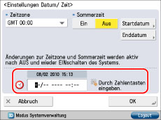 Berühren Sie die Taste [Enddatum] → Wählen Sie Monat, Tag und Uhrzeit für das Ende der Sommerzeit → Bestätigen Sie durch Berühren der Taste [OK].