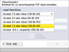 Wenn Sie [Acrobat 10.0 oder Vergleichbar] wählen, wird [Acrobat 10.0 o. vergleichb./256-Bit AES] angezeigt, wenn Sie die Verschlüsselungsebene wählen.