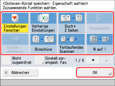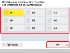 Berühren Sie die Taste [Einstell.voreingest. Fav.] → Wählen Sie die zugeordneten Favoriteneinstellungen → Berühren Sie die Taste [OK].