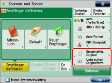 Berühren Sie nacheinander die Tasten [Einstellungen Funktion] → [Senden] → [Allgemeine Einstellungen].