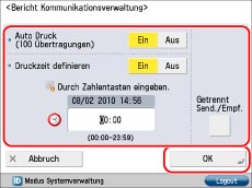 Wenn der Bericht zu einem bestimmten Zeitpunkt gedruckt werden soll, berühren Sie die Taste [Ein] → Geben Sie die Uhrzeit über die Zahlentasten - ein.