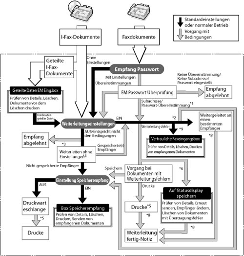 *9 Sie können die empfangenen Fax-/I-Faxdateien in der Vertraulichen Faxeingangsbox speichern, wenn Sie diese Box als Weiterleitungsempfänger festlegen.