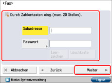 Berühren Sie die Taste [Subadresse] → Geben Sie das Passwort des Empfängers über die Tasten