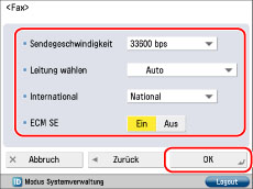 Wenn Ihre Dokumentübertragungen zu Beginn langsam sind, kann dies auf eine schlechte Qualität der Leitungen hinweisen. Wählen Sie eine niedrigere Sendegeschwindigkeit. Zur Auswahl stehen [33600 bps], [14400 bps], [9600 bps] und [4800 bps].