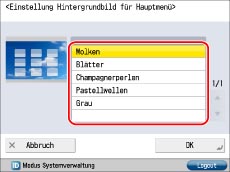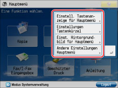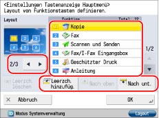 Wenn die Anzahl der Funktionstasten die unter <Einstellungen Hauptmenü Tastenanzeige> angegebene Tastenanzahl für das Layout überschreitet, werden die restlichen Tasten auf Seite 2 des Hauptmenüdisplays angezeigt. Auf dem Hauptmenüdisplay können höchstens neun Tasten angezeigt werden.