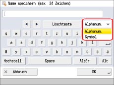 Wenn Sie während der Programmierung einer Funktion Zeichen eingeben müssen, berühren Sie wie nachfolgend erläutert die Buchstabentasten auf dem Sensordisplay.
