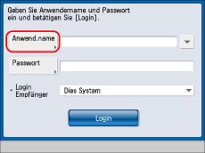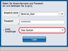 Wenn die Funktion <Authentisierung lokale Einheit> als Anwenderauthentisierung festgelegt ist, wird nur [Dies System] in der Auswahlliste für <Login Empfänger> angezeigt.