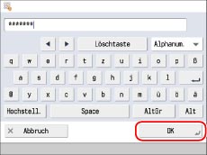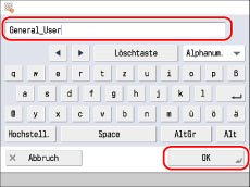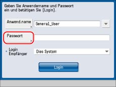 Wenn Sie die Active Directory Authentisierung von SSO-H verwenden wollen (einschließlich Durchführung der Active Directory Authentisierung mit der Funktion <Active Directory Authentisierung + Authentisierung lokales System>), können Sie nur alphanumerische Zeichen, - (Bindestrich), _ (Unterstrich), ` (Apostroph), { } (Geschwungene Klammern), ~ (Tilde), ! (Rufzeichen), # (Nummer), $ (Dollar), % (Prozentzeichen), & (Ampersand), ' (Anführungszeichen), ( ) (Klammern), @ (at-Zeichen) und ^ (Caret) für den Anwendernamen verwenden. Sie können nur einloggen, wenn Sie gültige Zeichen verwenden. (Sie müssen zwischen Großschreibung und Kleinschreibung unterscheiden.)
