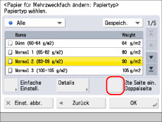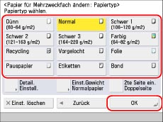 Sie können Papiertypen speichern, die nicht in <Detail. Einstell.> für die Auswahl des Papiertyps aufgeführt sind. Nähere Informationen zum Speichern eines benutzerdefinierten Papiertyps finden Sie im Abschnitt "Speichern/Bearbeiten anwenderdefinierter Papiertypen".