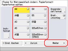 Wenn sich das Format des in das Mehrzweckfach eingelegten Papiers von dem Papierformat unterscheidet, das unter [Standard Mehrzweckfach speichern] in [Präferenzen] (<Einstellungen/Speicherung>) gespeichert wurde, deaktivieren Sie [Standard Mehrzweckfach speichern]. (Vgl. Abschnitt "Speichern der Grundeinstellungen für das Mehrzweckfach".)