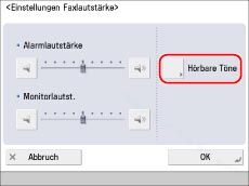 Mithilfe der Taste auf dem Bedienfeld können Sie die Alarmlautstärke für Faxsendung und Faxempfang sowie die Lautstärke des Übertragungssignals einstellen. Sie können auch diverse Tonsignale einstellen, die je nach Betriebsmodus oder Status des Geräts ertönen.