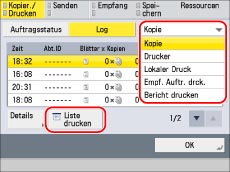 Berühren Sie die Auswahlliste → Wählen Sie den zu druckenden Auftragstyp → Berühren Sie die Taste [Liste drucken].