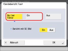 Wenn [Sendebericht] in [Einstellungen Funktion] (<Einstellungen/Speicherung>) auf 'Nur bei Fehler' oder 'Ein'gestellt ist, wird zusätzlich zum Sendebericht Fax auch ein Sendebericht gedruckt.