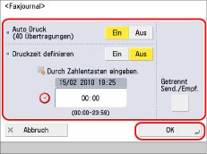 Berühren Sie die Taste [Ein], damit das Faxjournal automatisch gedruckt wird, wenn die Anzahl der ausgehenden und eingehenden Übertragungen 40 erreicht.