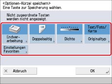 Sie können Kürzel für häufig verwendete Funktionen in [Optionen] erstellen. Sie können auch Kürzel zu [Einstellungen Favoriten] erstellen. Weitere Informationen zu Favoriteneinstellungen finden Sie unter "Speichern und Aufrufen von Favoriteneinstellungen (Favoriteneinstellungen)".. Diese Funktionskürzel werden auf dem Grundfunktionendisplay angezeigt.