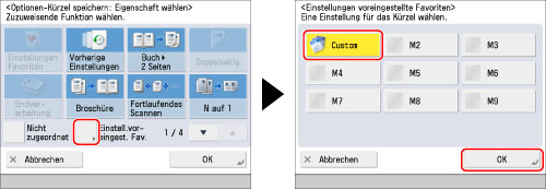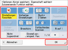 Berühren Sie die Taste [Einstell.voreingest. Fav.] → Wählen Sie die zugeordneten Favoriteneinstellungen → Berühren Sie die Taste [OK].
