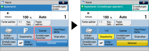 Die Einstellungen können ohne die Anzeige eines Bestätigungsdisplays mit dem Grundfunktionendisplay zum Kopieren abgerufen werden.
