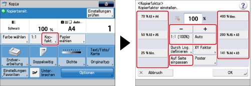 Um den Faktor auf 100 % zurückzusetzen, berühren Sie die Taste [1:1 (100 %)].