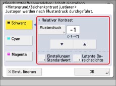 Wählen Sie die Farbe mit Bezug auf den Musterdruck ([Schwarz], [Cyan] oder [Magenta]) → Stellen Sie den Wert für den besten Musterdruck für [Relativer Kontrast] mithilfe der Tasten und ein.