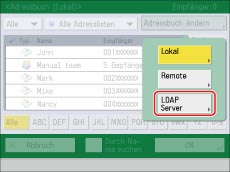Wenn Sie die Taste [Suche starten] ohne Eingabe von Suchkriterien berührt haben, werden alle auf dem LDAP Server gespeicherten Adressen angezeigt.