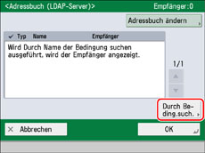 Die Anzahl der angezeigten Suchergebnisse kann die in [LDAP-Server speichern] gesetzte Grenze nicht überschreiten. Wenn der gesuchte Empfänger nicht angezeigt wird, erhöhen Sie entweder die maximale Anzahl der möglichen Suchergebnisse oder verändern Sie die Suchkriterien. (Vgl. Abschnitt "Speichern eines LDAP Servers".)