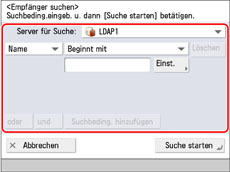 Sie können nicht nach einem Empfänger über einen LDAP-Server suchen, wenn die Zeiteinstellungen von Server und System mehr als fünf Minuten auseinander liegen. Wenn Sie nicht suchen können, obwohl die Angaben zu Anwendername und Passwort stimmen, prüfen Sie die Zeiteinstellungen auf dem Server und dem System.