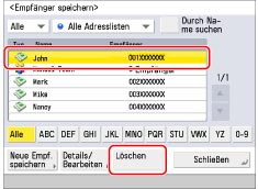 Wählen Sie den Empfänger, den Sie löschen wollen → Berühren Sie die Taste [Löschen].