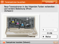 Eine vollständige Anleitung zum Austauschen der Tonerpatrone können Sie aufrufen, indem Sie [Vorherige] oder [Weiter] auf dem Sensordisplay berühren.