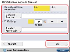 Berühren Sie [Einstellungen manuelle Adresse] für [Einstellungen IPv6] → Legen Sie die folgenden Optionen fest → Berühren Sie [OK].