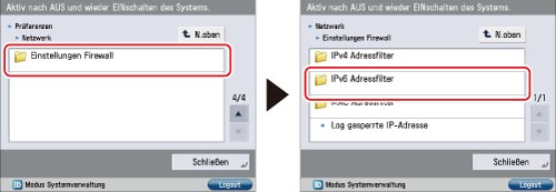 Berühren Sie [Einstellungen Firewall] für [Netzwerk] → [IPv6-Adressfilter].