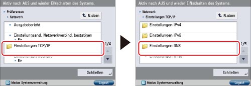 Berühren Sie [Einstellungen TCP/IP] → [Einstellungen DNS].