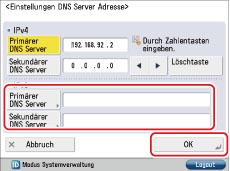 Wenn Sie das dynamische DNS-Update verwenden möchten, berühren Sie [Primärer DNS-Server] → Geben Sie die IPv6-Adresse des DNS-Servers ein → Berühren Sie [OK].