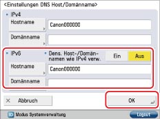 Wenn Sie <Dens. Host-/Domännamen wie IPv4 verw.> aktiviert haben, werden für IPv6-Kommunikation derselbe Hostname und derselbe Domänenname wie für IPv4-Kommunikation verwendet.
