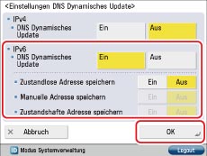 Berühren Sie [Einstellungen DNS Dynamisches Update] für [Einstellungen DNS] → Legen Sie die folgenden Elemente in <IPv6> fest → Berühren Sie [OK].
