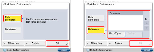 Zum einzelnen Festlegen einer Portnummer: Berühren Sie [Definieren] → Berühren Sie [Hinzufügen] und geben die Portnummer ein → Berühren Sie [OK].