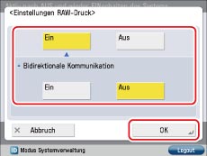 Berühren Sie [Einstellungen RAW-Druck] für [Einstellungen TCP/IP] → Legen Sie die folgenden Optionen fest → Berühren Sie [OK].
