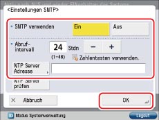 Wenn Sie die SNTP-Zeitsynchronisierung verwenden möchten, berühren Sie [Ein] für <SNTP verwenden>.