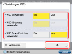 Wenn Sie die Druckanwendung WSD (Web Services on Devices) verwenden möchten, berühren Sie [Ein] für <WSD verwenden>.
