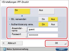 Wenn Sie die IPP-Authentisierungsfunktion verwenden möchten, berühren Sie [Ein] für <Authentisierung verw.>. Berühren Sie [Anwendername] → Geben Sie den Anwendernamen für die IPP-Authentisierung ein → Berühren Sie [OK]. Berühren Sie [Passwort] → Geben Sie das Passwort für die IPP-Authentisierung ein → Berühren Sie [OK]. Geben Sie zur Bestätigung dasselbe Passwort ein → Gerühren Sie [OK].