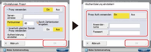 Wenn Sie die Proxy-Authentisierung verwenden möchten, berühren Sie [Authentisierung einstellen] → Berühren Sie [Ein] für <Proxy-Auth.verwenden>. Berühren Sie [Anwendername] → Geben Sie den Anwendernamen für die Proxy-Authentisierung ein → Berühren Sie [OK]. Berühren Sie [Passwort] → Geben Sie das Passwort für die Proxy-Authentisierung ein → Berühren Sie [OK]. Geben Sie zur Bestätigung dasselbe Passwort ein → berühren Sie [OK].