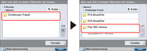 Berühren Sie [Einstellungen Firewall] für [Netzwerk] → [Filter MAC-Adresse].