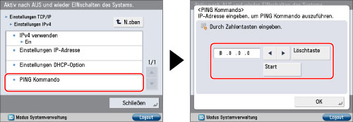 Berühren Sie [PING Kommando] für [Einstellungen IPv4] → Geben Sie eine auf dem Netzwerk vorhandene IPv4-Adresse ein → Berühren Sie [Start].