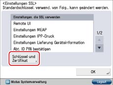Berühren Sie [Einstellungen SSL] für [Einstellungen TCP/IP] → [Schlüssel und Zertifikat].