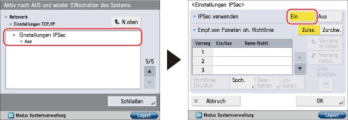 Berühren Sie [Einstellungen IPSec] für [Einstellungen TCP/IP] → Berühren Sie [Ein] für <IPSec verwenden>.