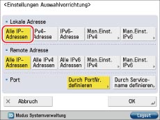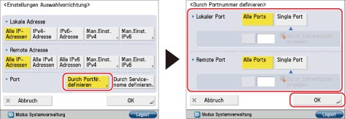 Berühren Sie [Durch PortNr. definieren] für [Port] → Geben Sie <Lokaler Port> und <Remote Port> an → Berühren Sie [OK].