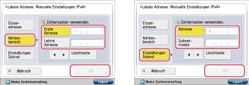 So geben Sie die Subnetzmaske ein: Berühren Sie die Taste [Einstellungen Subnet] → Berühren Sie [Adresse] → Geben Sie die IPv4-Adresse ein → Berühren Sie [Subnetmaske] → Geben Sie die Subnetmaske ein.