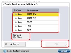 Wählen Sie einen angezeigten Servicenamen aus → Berühren Sie [Service Ein/Aus] → Berühren Sie [OK].