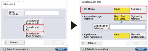 Berühren Sie [Einstellungen IKE] → Wählen Sie den für IKE Phase 1 zu verwendenden Modus aus.