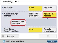 Berühren Sie [Digitale Sig. Methode] für <Authentisierungsmethode> → [Schlüssel und Zertifikat].